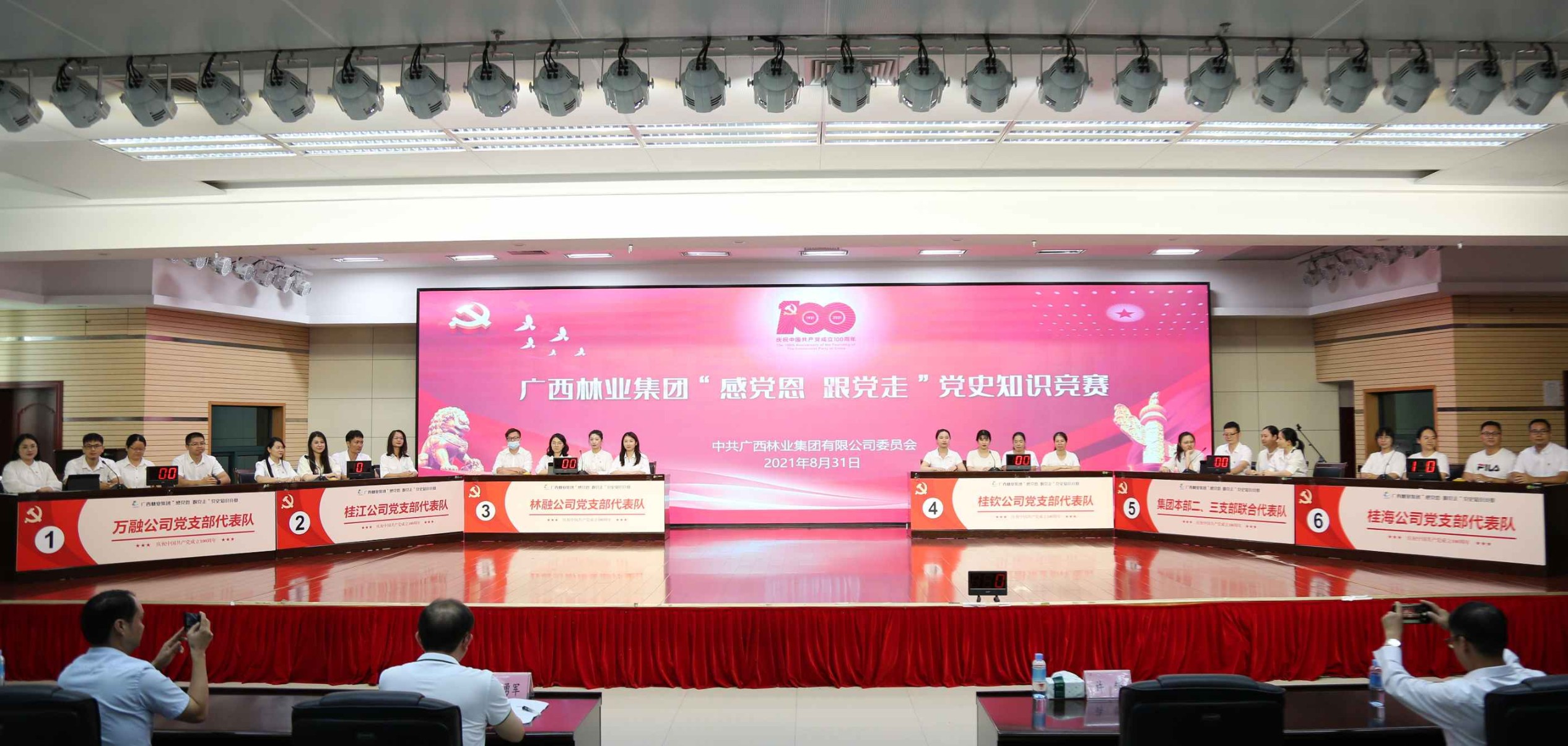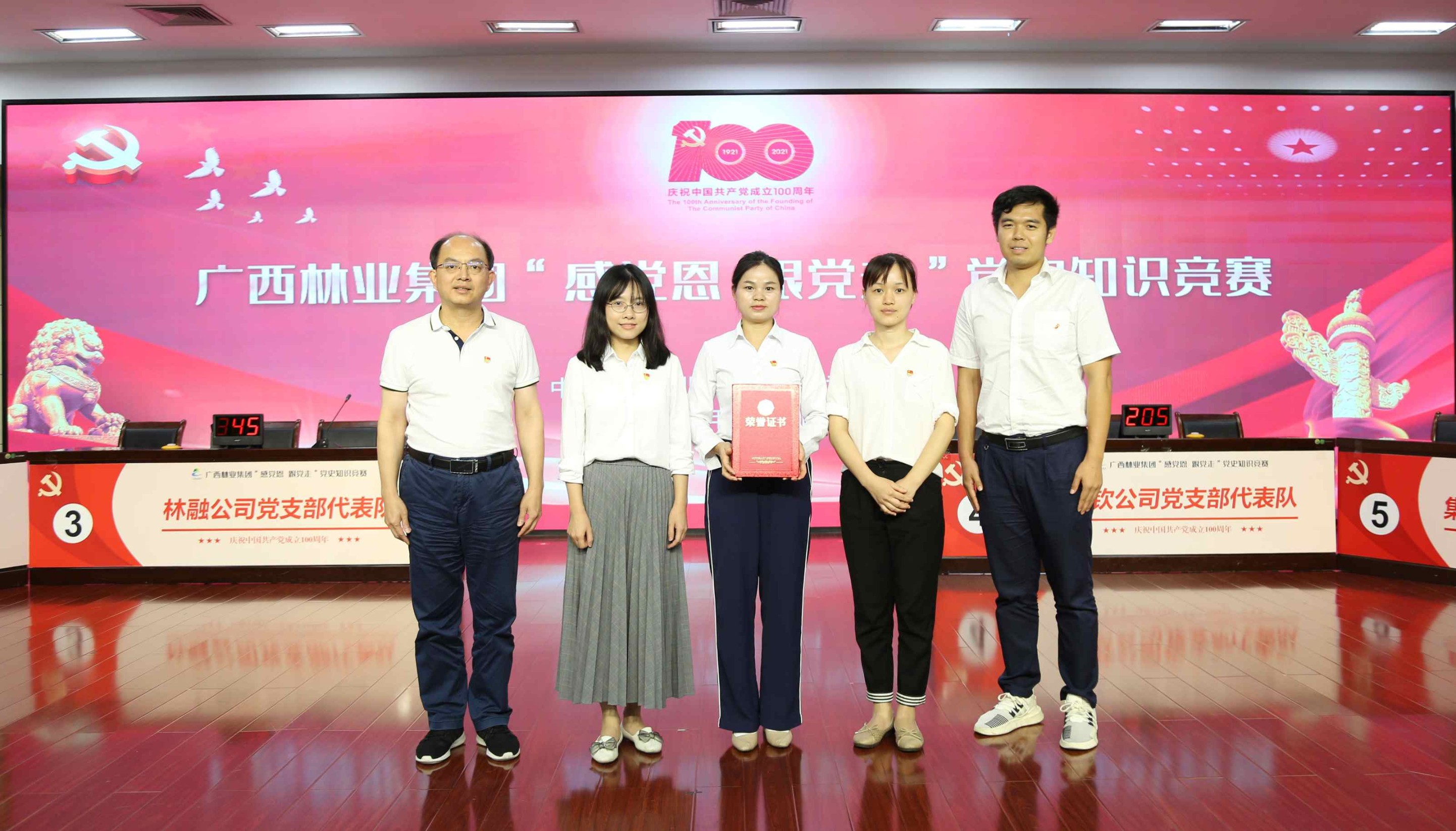 比賽中,參賽選手精神飽滿、反應(yīng)迅速、沉著答題、踴躍搶答,展現(xiàn)了扎實(shí)的黨史知識(shí)功底和良好的黨史學(xué)習(xí)教育成效。經(jīng)過激烈角逐,林融公司黨支部代表隊(duì)榮獲廣西林業(yè)集團(tuán)“感黨恩 跟黨走”黨史知識(shí)競(jìng)賽冠軍,集團(tuán)本部一支部代表隊(duì)榮獲亞軍,桂江公司黨支部代表隊(duì)榮獲季軍,集團(tuán)本部二、三支部聯(lián)合代表隊(duì)、桂欽公司黨支部代表隊(duì)、桂谷公司黨支部代表隊(duì)等獲優(yōu)勝獎(jiǎng)。